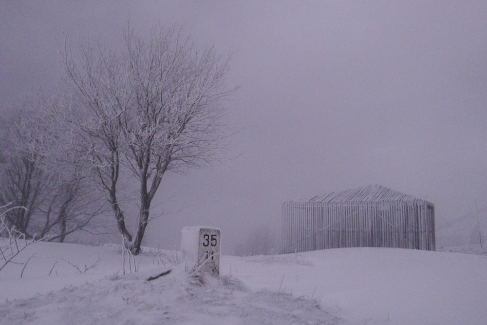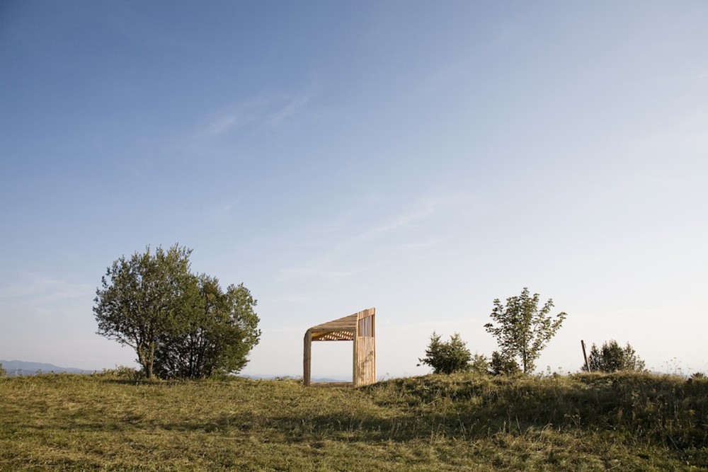 Dal monte Kolovrat, sul confine italo-sloveno, la vista si estende fino al mare inquadrando la linea dell’orizzonte e sud e le Alpi con il monte Krn a nord. Si tratta di uno spazio intimo, un cannocchiale visivo da cui poter godere della bellezza del paesaggio. L’architettura si integra nella natura mutevole delle varie stagioni dell’anno e il legno reagisce alle diverse condizioni climatiche.